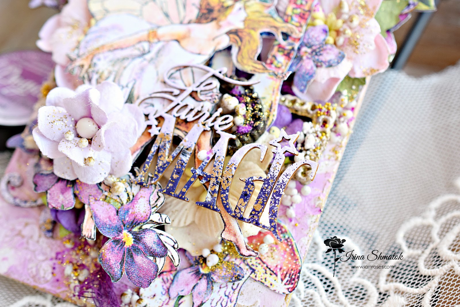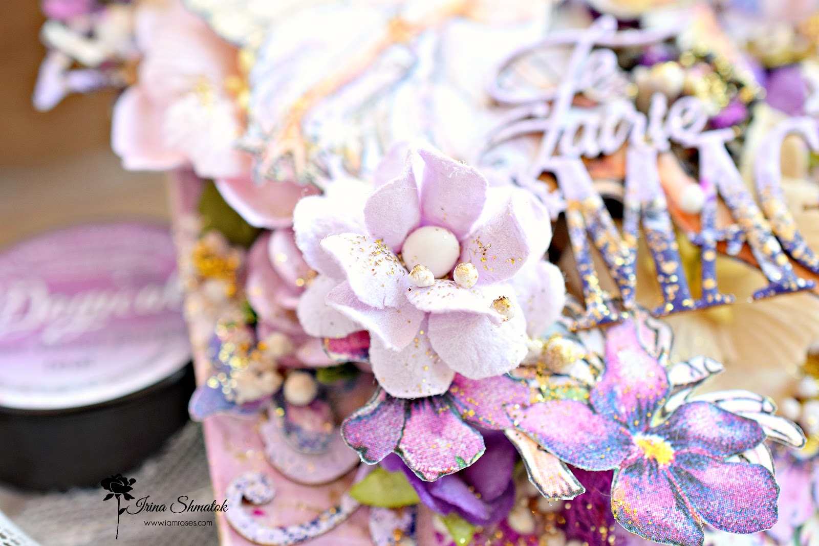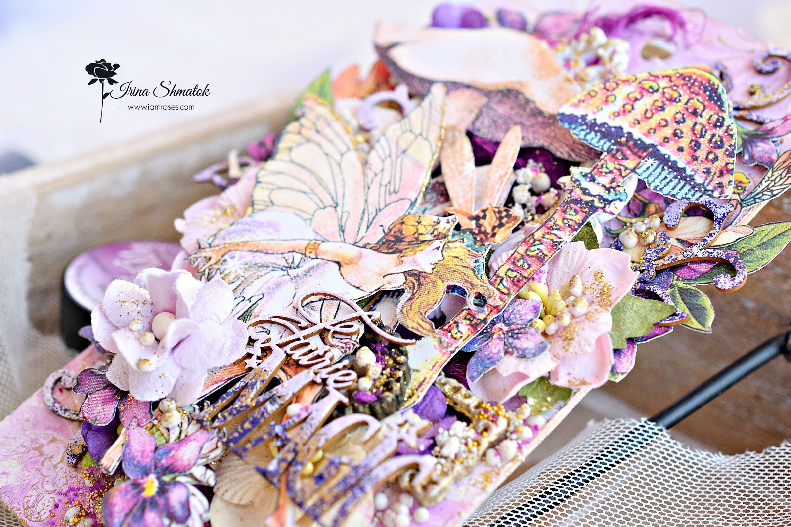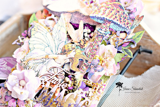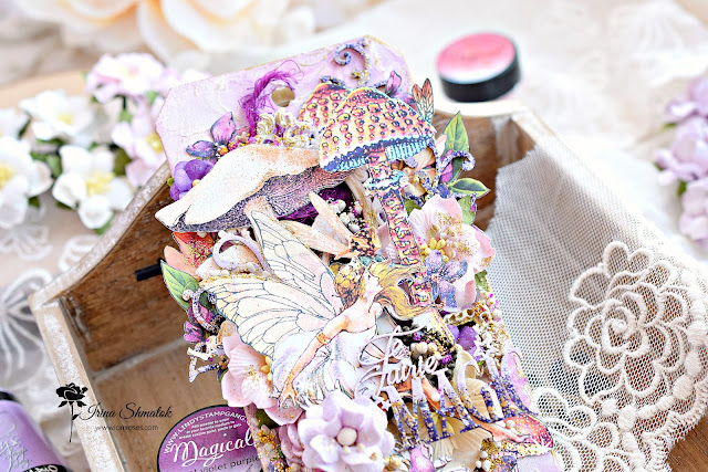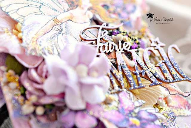 Вдохновение накрыло меня с головой . Решила будет миксмедийный тег, конечно же из Graphic45 "Fairie Dust " и невероятным чипбордом от " Рукоделушка ". Работу делала специально для производителя уникальных цветов I Am Roses . В работе впервые использовала спреи и порошки от Lindisgang , очень понравилось.