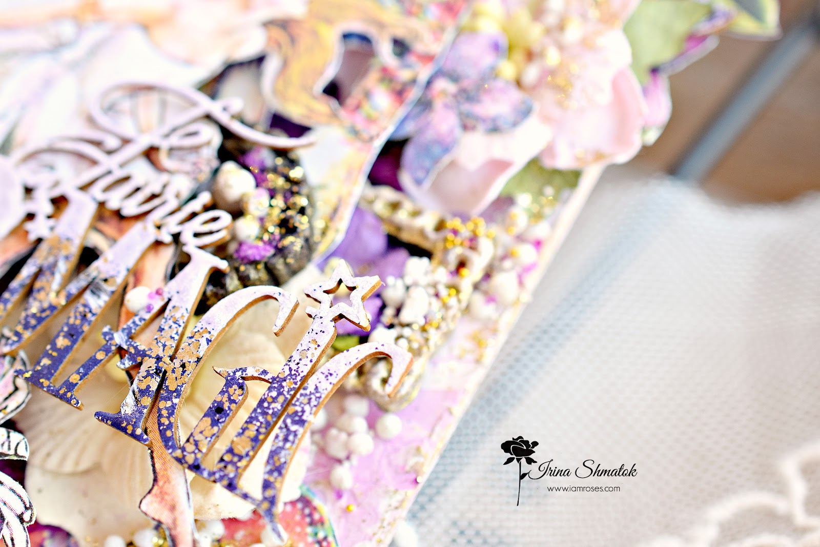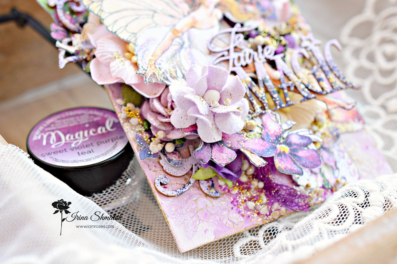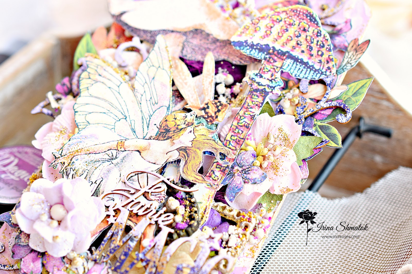 Вдохновение накрыло меня с головой . Решила будет миксмедийный тег, конечно же из Graphic45 "Fairie Dust " и невероятным чипбордом от " Рукоделушка ". Работу делала специально для производителя уникальных цветов I Am Roses . В работе впервые использовала спреи и порошки от Lindisgang , очень понравилось.