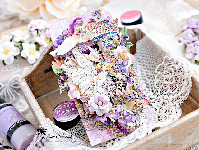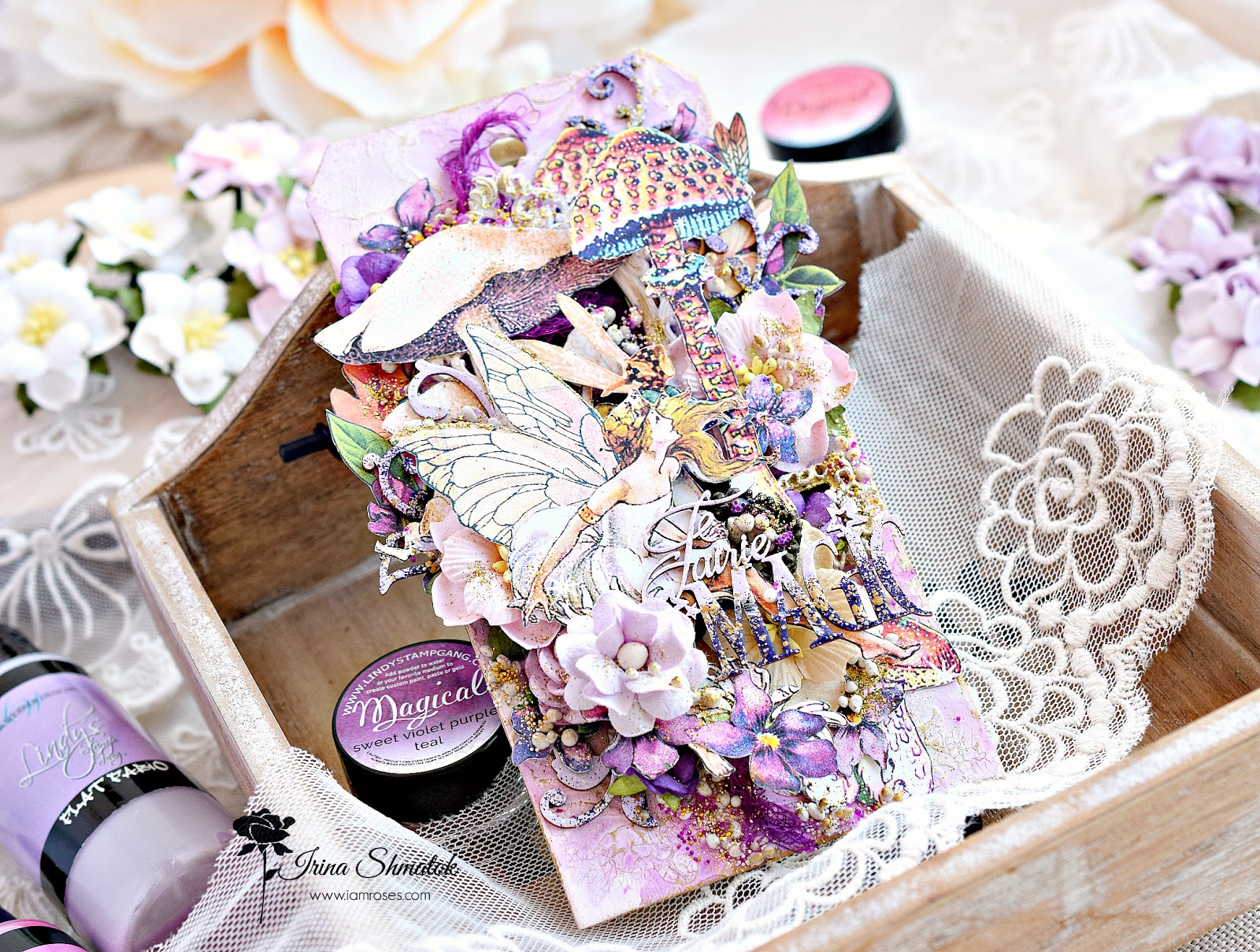 Вдохновение накрыло меня с головой . Решила будет миксмедийный тег, конечно же из Graphic45 "Fairie Dust " и невероятным чипбордом от " Рукоделушка ". Работу делала специально для производителя уникальных цветов I Am Roses . В работе впервые использовала спреи и порошки от Lindisgang , очень понравилось.